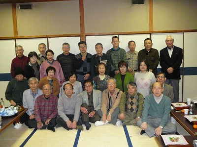 ![]() 集合写真 酔いが回るとだらしない顔となるので、その前に 集合写真をとの意見が出て、皆でカメラに納まる。 |