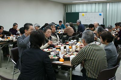 ![]() 食事風景 今年の忘年会は、会員数の増加により、会の会計に 余裕が出来、援助金を少しだしたので、食事が上等になる。 |